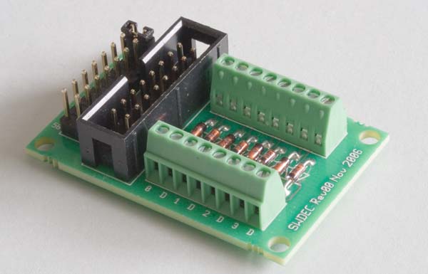 Degenen die toch een meer gestructureerde oplossing zoeken kunnen gebruik maken van de SWdec. Dit is een printje waarop de diodes voor 8 schakelaar-aansluitingen zijn ondergebracht. De SWdec modules kunnen met een jumper op het gewenste adres worden ingesteld en de schakelaars kunnen worden aangesloten met schroefverbindingen.